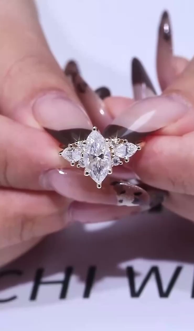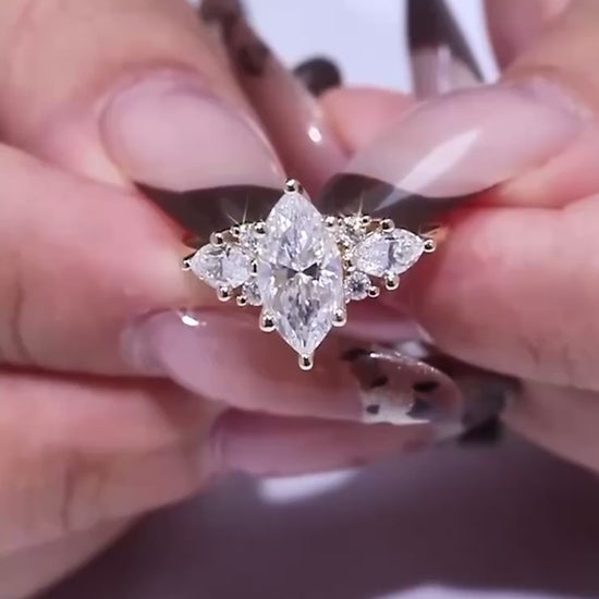 A stunning piece crafted in 14k yellow gold, featuring a total of 1.5 carats of diamonds. The centerpiece is a marquise-cut diamond, which accounts for a significant portion of the 1.5 carats, given its prominent size and elongated shape. Surrounding it is a halo of smaller round-cut diamonds, adding to the overall brilliance and carat weight. Additionally, the two pear-shaped diamonds on either side of the center stone contribute to the total diamond weight, enhancing the ring’s elegant and symmetrical design.
