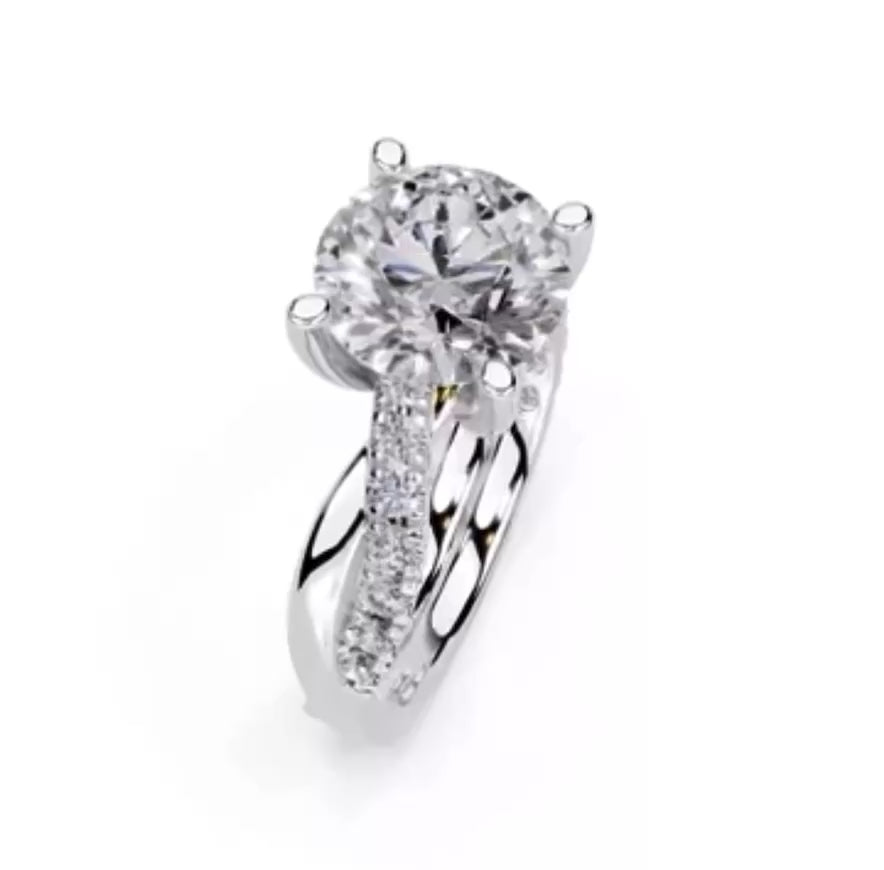 The band of the ring is intricately crafted with a twisted design, adding a touch of sophistication and uniqueness. Along one side of the twist, a row of smaller round-cut diamonds is pavé-set, creating a sparkling accent that extends down the band. These accent diamonds are meticulously placed to ensure continuous shimmer, enhancing the ring’s luxurious appeal.