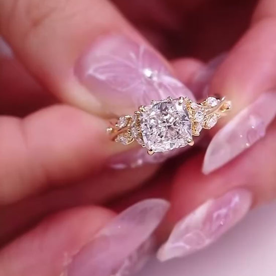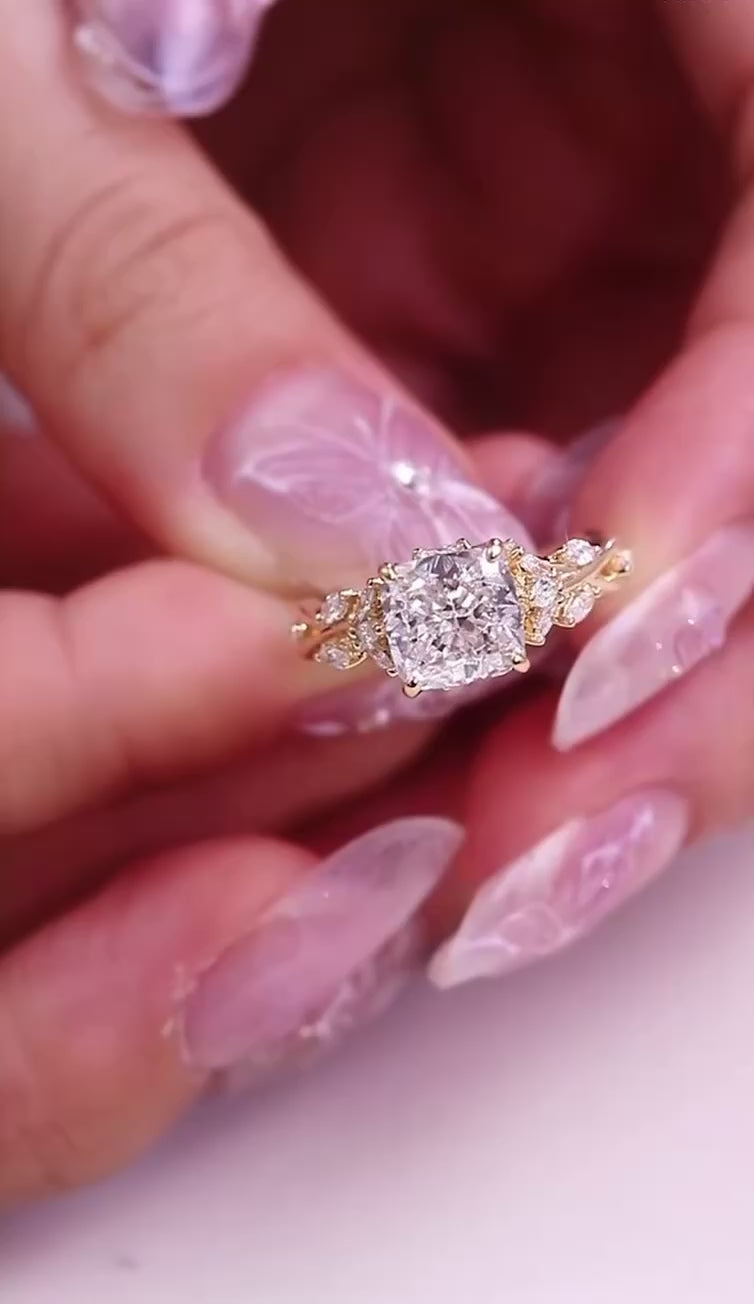 Breathtaking piece crafted in 18k gold an intricate arrangement of smaller diamonds, predominantly marquise and round cuts, set in a nature-inspired design that resembles delicate branches or vines. These accent diamonds are meticulously placed along the twisting gold band, adding both elegance and additional carat weight to the ring. The twisted band design not only provides a unique aesthetic but also symbolizes unity and strength, making it a meaningful choice for an engagement ring.